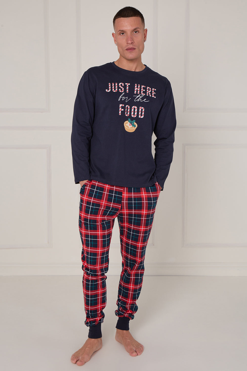 Design: “Just Here for the Food” festive slogan print on a navy long-sleeve top